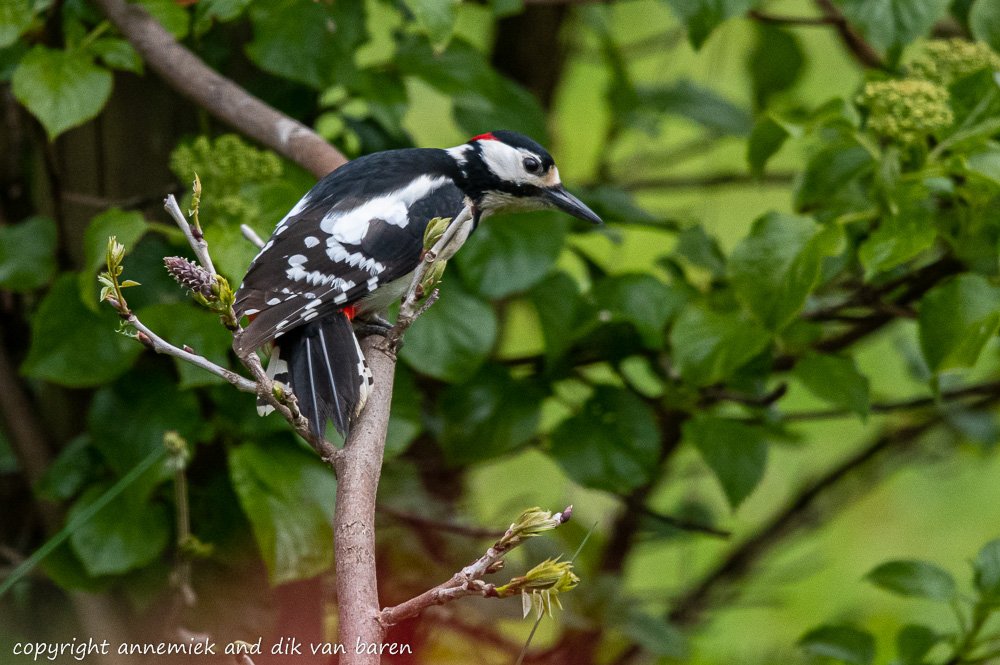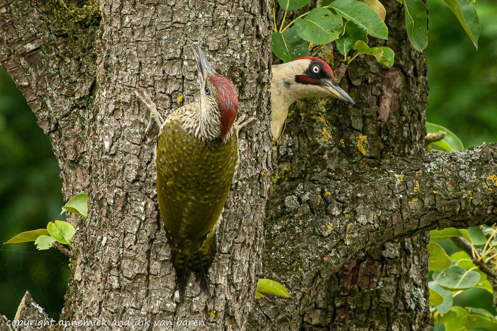 Example 10 Holland Green Woodpecker (Groene Specht) man and juvenile 22 meter cloudy tripod D800 Nikkor 300mm f/4.0D (non VR) TC-20E III equivalent 600mm substantial camouflage.