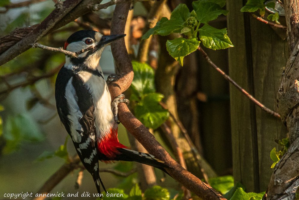 Example 1 (mind the underlined differences with our benchmark picture): Holland Great Spotted Woodpecker (Grote Bonte Specht) 10 meter sun D500 Nikkor 500mm f/4E PF VR TC-14E equivalent 630mm crop 3000 x 2000 pixels. Compared to: GBS 25cm 10m cloudy clean air rounded 500mm equivalent. The idea is: “Using this equipment in this situation photographing this bird at this distance, etcetera: How does this situation, regarding reach (bereik), compare to my standard picture of a Great Spotted Woodpecker 25cm height, distance 10 meter, using 450 equivalent etcetera?”: