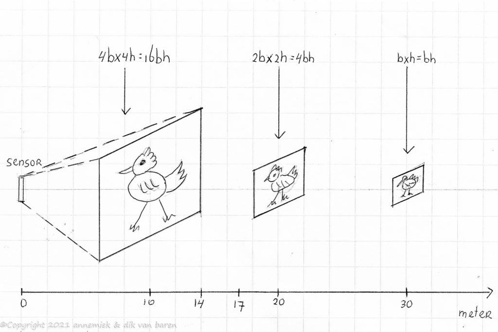 A bird twice as high compared to our benchmark picture will contain four times as much detail because both hight and width are (more or less) twice the hight and width of our benchmark Woodpecker so the surface of the bird in the picture will contain four times as much detail. In the same way an increasing distance will result in a quadratically decreasing amount of detail. It will follow an “inverted” quadratic rule.