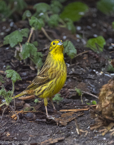 Hieronder een vergelijkbare opname nu echter van man Geelgors, ook in onze tuin met dezelfde apparatuur, bij zonlicht: