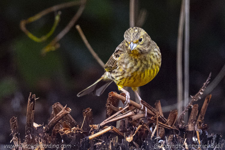 Holland febr 2026 late afternoon cloudy, Yellowhammer (female Geelgors), size 17cm, distance 10m, Nikon Z7 II Nikkor 500mm f/5.6E PF VR equivalent 750mm, ISO value 180.000.